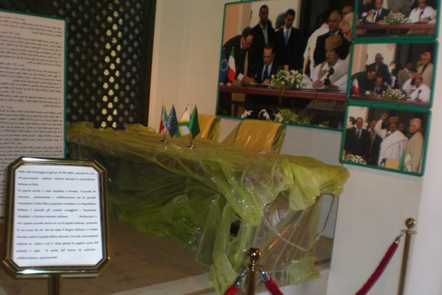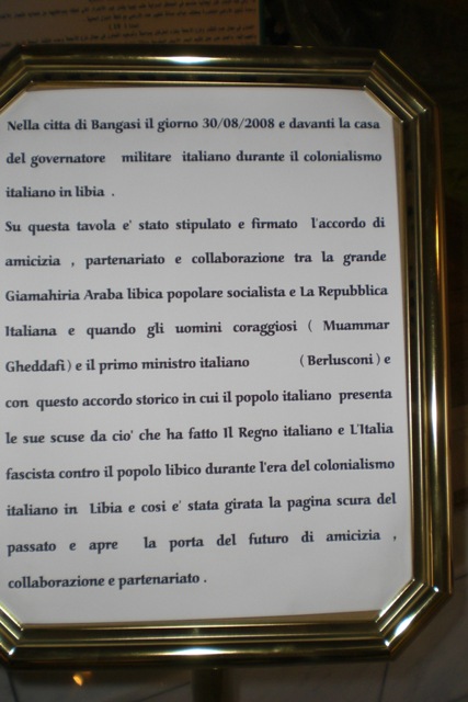 Su questa tavola è stato stipulato e formato l’accordo di amicizia, partneriato e collaborazione tra la grande Giamahiria Araba libica popolare socialista e la La Repubblica Italiana e quando gli uomini coraggiosi (Muammar Gheddafi) e il primo ministro italiano ((Berlusconi) e con questo accordo storico in cui il popolo italiano presenta le sue scuse da cio’ che ha fatto il Regno italiano e l’Italia fascista contro il popolo libico durante l’era del colonialismo italiano in Libia e così è stata girata la pagina scura del passato e apre la porta del futuro di amicizia, collaborazione e partenariato”.